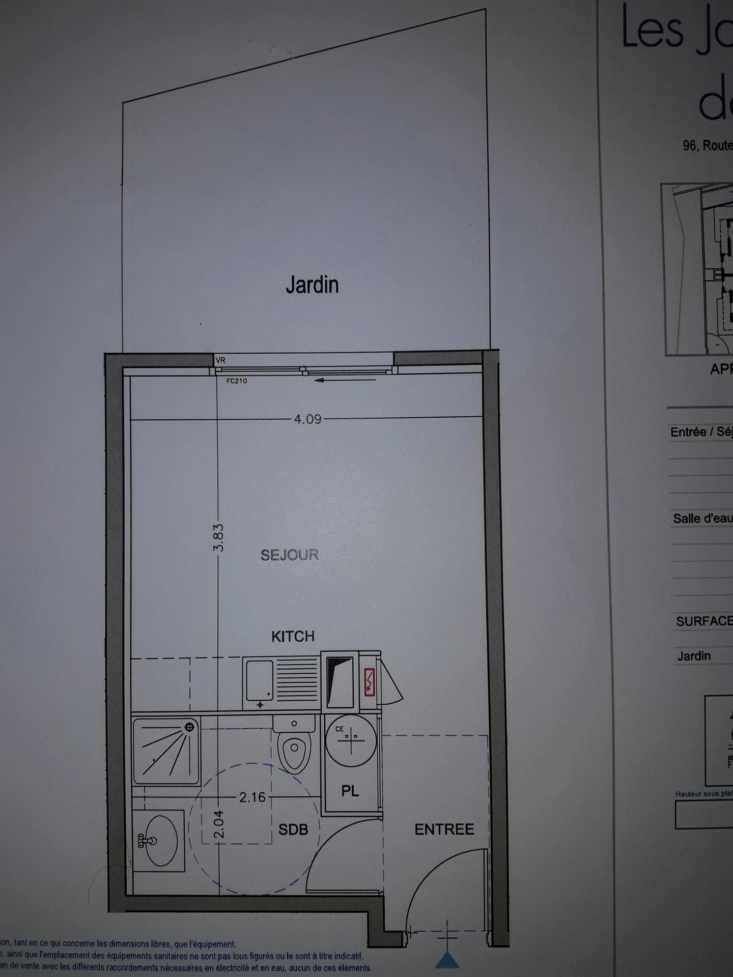 L'appartement est composé d'une entrée, d'un séjour avec coin cuisine aménagée, ouvrant sur un jardin de 14.69m² et d'une salle de douche avec WC. Un garage fermé en sous-sol complètent l'appartement.